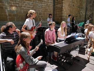 Aquí tenéis algunas imágenes del concierto que ofrecimos en la Plaza de San José, en el marco del Festival IFOB. En este concierto pudimos contar con una compañía muy especial: la actuación de alumnado de la Rock School de Bayona y del Conservatorio de la misma ciudad. Se trataba del concierto "de ida" de un intercambio que tuvo su respuesta unos días después en Bayona.